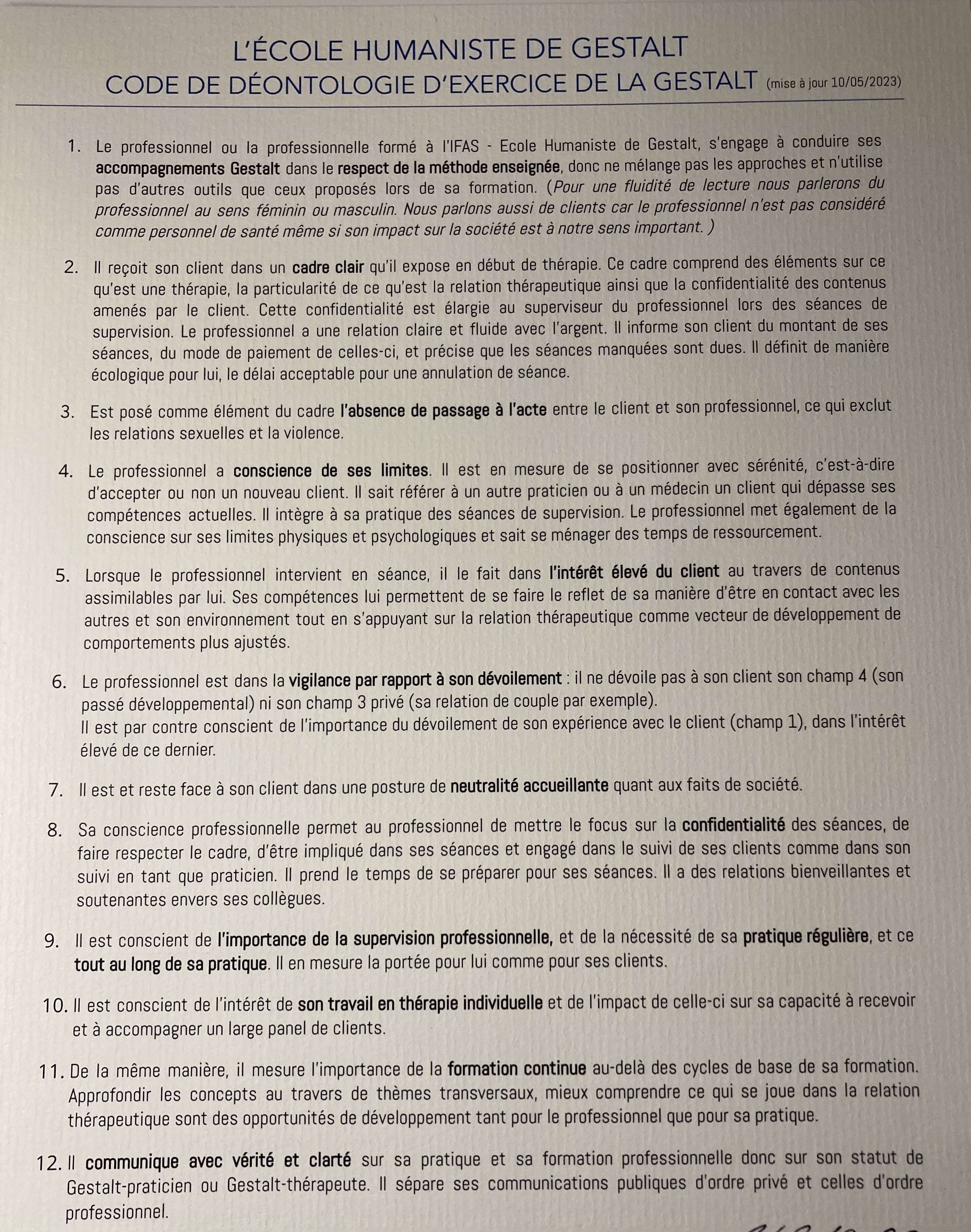 Ma formation à la Gestalt-thérapie humaniste intégrative au sein de l'école humaniste de Gestalt m'a permis d'acquérir une compréhension approfondie des processus humains et des dynamiques relationnelles. Vous trouverez ci dessous un témoignage ou je partage mon expérience, mes ressentis et quelques concepts de la Gestalt suite à un résidentiel lors de ma 5ème année intitulée "Buts de Vie". Pour ce faire il vous suffit de cliquer sur le lien Témoignage Ecole Humaniste de Gestalt.